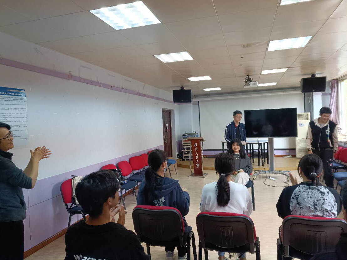 接下来,冉老师带领大家做了一个名叫“大风吹”的热身游戏,通过游戏规则选出的同学为大家表演一个小品,这使大家在轻松愉快的氛围下逐渐变得熟悉起来。