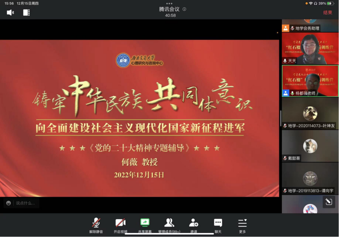 宣讲团成员。专题讲座上,何薇教授首先从充分认识学习宣传贯彻党的二十大精神的重大意义出发,从九个方面深刻解读学习领会党的二十大精神,随后分别从中央民族工作会议精神中关于“铸牢中华民族共同体意识”的“十二个必须”展开讲述,着重从历史方位、重要任务、工作主线方面进行了详实介绍。