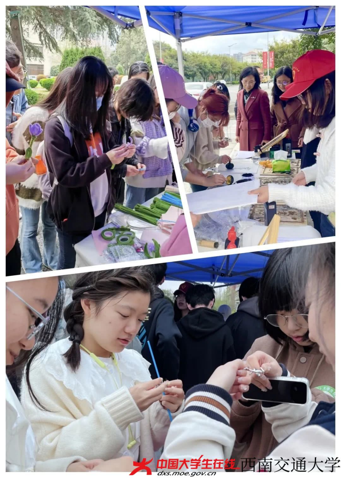 在“一心一意 以文润心”活动现场(犀浦校区南门小广场、九里校区图书馆门口),同学们参与的情况比较火爆。“扭扭郁金香”、“巧解连环”和拓印活动让不少同学乐在其中。刘娣老师引导同学们拓印心理疏导相关的词句、体验破解鲁班锁、九连环套等益智游戏,利兹学院的余典老师现场指导同学们负责制作“扭扭花”。这些活动向同学们展示古人的智慧,用中华优秀传统文化沁润同学们的心田。