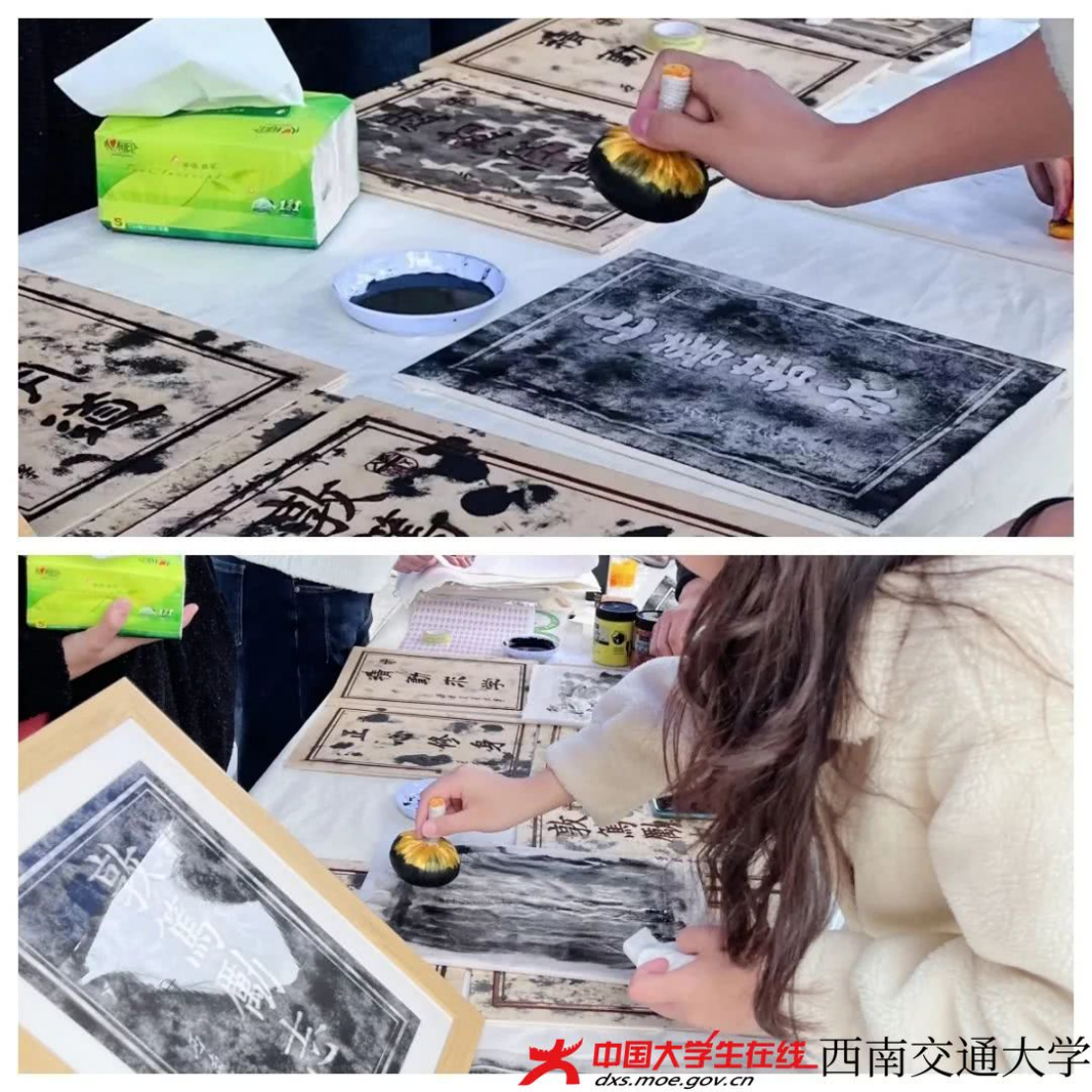 在九里校区现场,不少同学参与拓片活动。蒋洪波老师在引导同学们拓片的同时,细心地讲解这个活动对疏缓心态的作用。既训练了同学们拓片的技能,调整了气息,疏缓了情绪,又让同学们在拓印的过程中将“正心修身”“正心明道”“精勤求学”“敦笃励志”“果毅力行”“忠恕任事”“知止不殆”等词铭记于心。