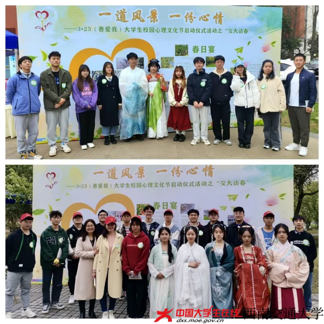 在“一道风景 一份心情”活动现场(犀浦校区西门银杏大道路口、九里校区镜湖宾馆路口),现场为同学们配送了蕴含在学校春色中的诗句。一群汉服爱好者散落在学校景观带,蓦然回首,亭亭玉立在那春色中。