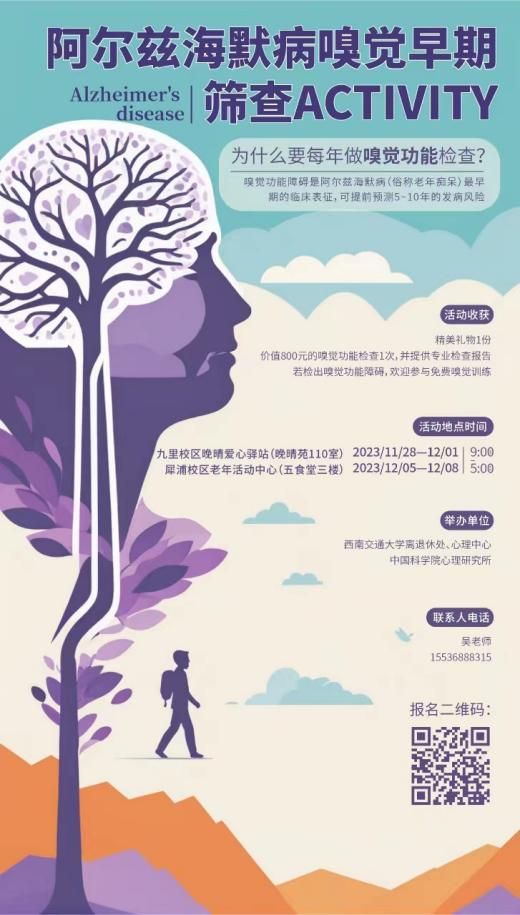 依托校工会职工心灵驿站,携手校离退处于2023年11月28日到12月8日,分别在九里和犀浦校区开展了为期一周的“关爱认知健康,乐享老年生活”阿尔兹海默病早期嗅觉功能检查活动。