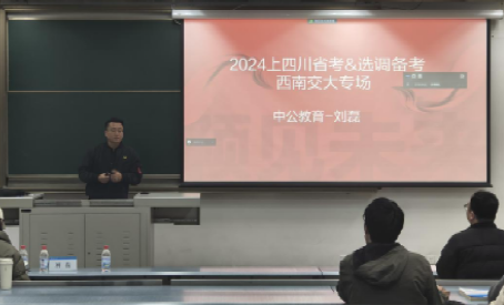 犀浦校区X1215教室举办了一场线上线下结合的学思讲坛——公务员笔试备考指导讲座。此次讲座邀请了中公教育四川研究院院长刘磊担任主讲嘉宾。