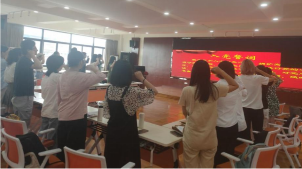会议的最后,全体党员在鲜红的党旗下,紧握右拳,铿锵有力地宣读入党誓词。