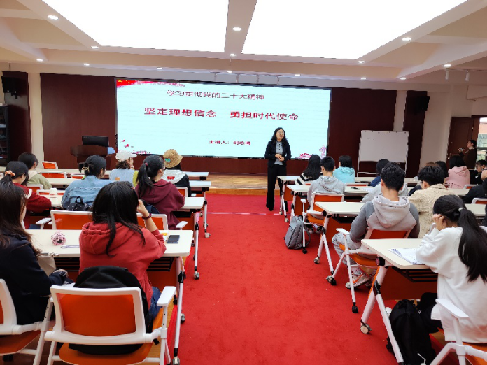 为深入学习贯彻党的二十大精神,开展好新生思想政治教育,让2022级新生坚定理想信念,敢于承担责任,AV大平台 于10月28日下午2点在X5501开展了“坚定理想信念,勇担时代使命”主题学习。本次专题学习由AV大平台 党委书记刘咏梅主讲,AV大平台 22级本研全体新生参加。