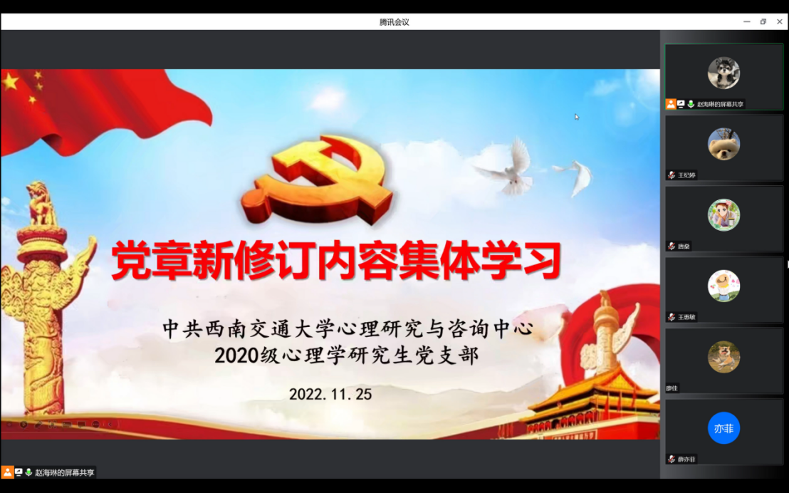 为进一步学习贯彻党的二十大精神,引导党员全面、准确理解党章内容,11月24日,2020级心理学研究生党支部通过腾讯会议开展了“党章新修订内容集体学习”线上学习会。