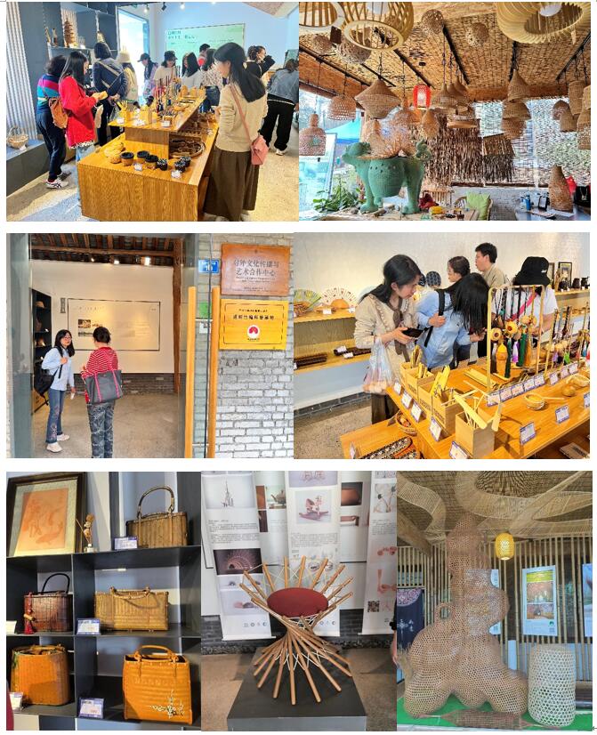 浏览完罨画池古建筑群落,老师们又一同前往崇州道明竹艺村,欣赏手工艺人的匠心制作——道明竹编。“道明竹编”是四川省崇州市道明镇的特产,同时也是国家非物质文化遗产、国家地理标志性产品,而竹艺村便是以竹编艺术品为生的艺术村落,更是乡村振兴的典范。