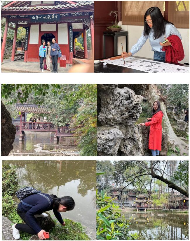 移步换景,老师们参观完陆游祠后来到了罨画池,池旁是参天古木,池内是亭台楼榭,一步一景都是如此的惬意美好,呈现出唐宋衙署园林的独特景观。身在其中让人有“一眼千年”的罨画意境。