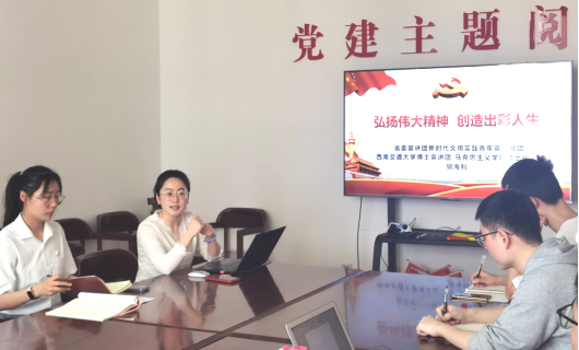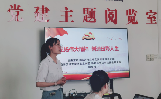 在微党课的讲授中,胡海利同志以四川省和交大作为切入点,从新民主主义革命时期、社会主义革命和建设时期、改革开放和社会主义现代化建设新时期以及中国特色社会主义新时代选取了四个精神,结合生动感人的事迹进行了讲述。她强调,我们党员应该弘扬伟大精神,做有理想、敢担当、能吃苦、肯奋斗的新时代好青年,让青春在全面建设社会主义现代化国家的火热实践中绽放绚丽之花。