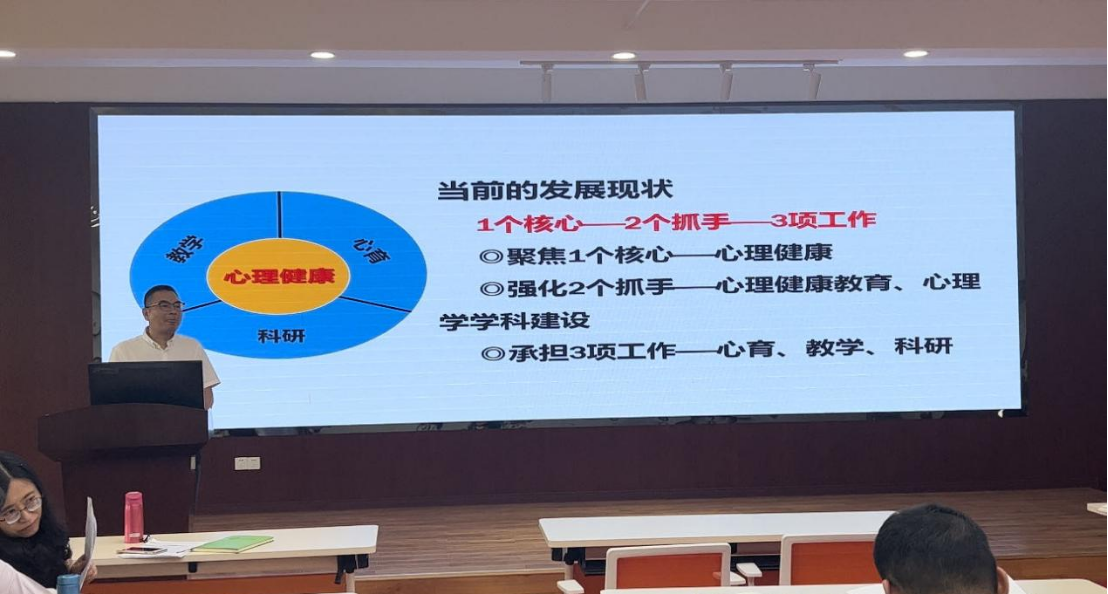 雷鸣同志结合学校第十五次党代会报告以及中心当前的发展现状、前期主题教育调研的情况,面对中心当前发展的实际,从教育部对高校开展心理健康教育工作的要求、“双一流”建设对专业学科发展的要求,分享了天津大学、吉林大学、电子科技大学、北京航空航天大学、北京师范大学、华南师范大学等高校心理健康教育的工作模式和工作亮点,谈到了北京师范大学、华南师范大学、西南大学、华中师范大学、中山大学、武汉大学、广州大学、四川师范大学等高校心理学专业学科的建设情况以及经验。