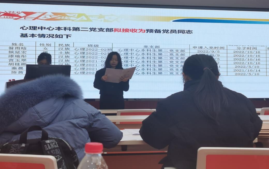 本科生第二党支部于2023年12月15日下午16时30分在X5501召开了支部大会,讨论关于接收昝雨晗、候延宏、漆瑜彤、胡桂榔、陈茜、宫玉翠、秦晨等七名同志为中共预备党员事宜。参加此次会议的有AV大平台