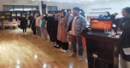 在支部书记樊菊同志的带领下全体党员面向党旗共同重温入党誓词,通过宣誓党员同志们更加坚定了自己的理想信念,不忘初心,牢记使命。