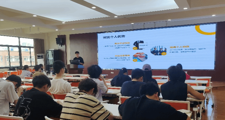 其次,张凯旋学长进行了就业分享。他从行业发展趋势和行业人才要求出发,着重讲解了简历制作、简历投递与面试技巧,通过分享优秀简历和成功就业经验,鼓励同学们明确职业目标、持续学习提升、拓展人脉资源。