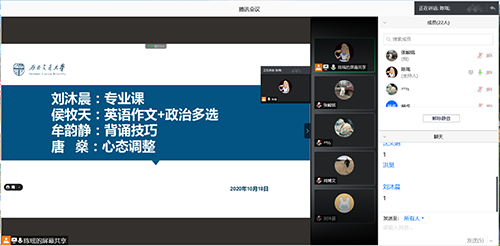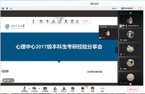 2017级本科生联系了四位2020级研究生学长学姐,为正在复习考研的2017级本科生做了一场考研经验分享会,并解答他们提出的心理学考研复习的相关问题。本次分享会在腾讯会议召开,由辅导员陈瑶老师主持,2017级全体考研同学参与本次会议。