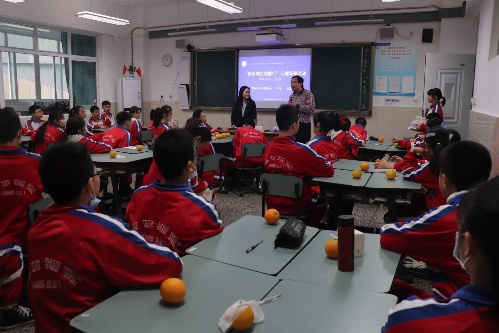 来自科普基地的志愿者申宇以及王惠敏为八年级5班的同学们带来了“小小发电站”水果发电站实验。首先,申宇从多个角度讲述了“我们为什么要环保”,并引导同学们发表自己的看法。接着,王惠敏带领大家开始了水果发电实验,在实验中,同学们积极发现问题、解决问题,在合作中收获的不止是环保知识的储备,也收获了小组相互协作的意识以及认识到其重要性。