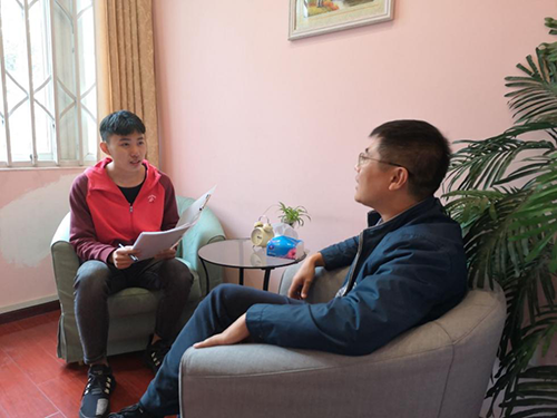 本科2019-02班全体同学参加由2019-02班团支部组织的“共抗疫情,从心出发”——榜样采访活动,采访活动在二号教学楼心理咨询室进行,同学们对在疫情期间为抗击新冠疫情提供心理援助的杨兴鹏老师和冉俐雯老师进行采访。