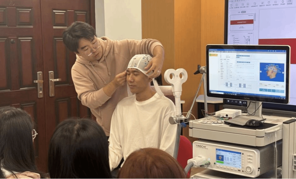 随后,同学们学习了经颅磁刺激仪的使用。该仪器具有非侵入性、靶向性、调节神经活动的灵活性等特点,这些特点使其在临床上得到了广泛应用。老师强调在使用该仪器进行治疗前,需向患者详细解释经颅磁刺激(TMS)的治疗过程、可能的感觉和预期效果,以减轻患者的焦虑和恐惧,同时要求患者取下身上的金属物品,如项链、耳环、手表等,避免磁场干扰。