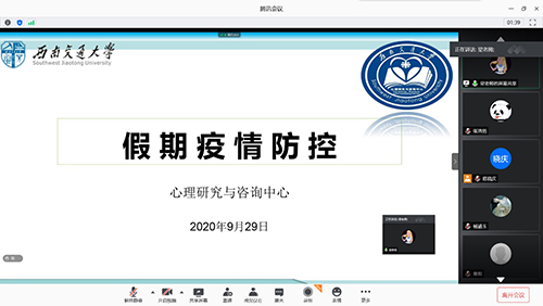 会议包括疫情防控,出行安全,在校管理三个部分。梁坡老师提到,同学们在假期间要勤加洗手,注重个人和寝室卫生;打喷嚏,咳嗽时用纸巾遮住口鼻;均衡膳食,劳逸结合,适度运动以增强抵抗力,如出现发热、咳嗽等可疑症状时,及时报告辅导员。此外,梁老师还向同学们介绍了西南交大学生在校期间出现发热或疑似症状处理流程,假期出行安全和在校管理的有关注意事项:“海上升明月,天涯共此时,值此新中国成立71周年和2020中秋佳节到来之际,希望同学们在欢度假期的同时合理安排学习和文化生活,严格遵守学校放假时间,如有异常情况可以及时向老师处理、报告。”