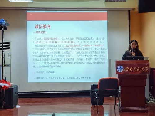 班会开始时,辅导员王丽霞老师和同学们强调了校园安全及寒假返乡安全问题,提醒大家注意财产和人身安全,离校前做好返乡登记。随后,王丽霞老师提出了此次班会的重要主题“诚信”,由考试诚信延伸至社会诚信,一方面,带领大家学习四六级、期末考试规章制度及违纪处分条例,宣传国家关于失信人的监督处罚办法;另一方面,列举考试期间违纪及社会诚信案例,引领同学们遵守诚信准则,践行诚信品德。