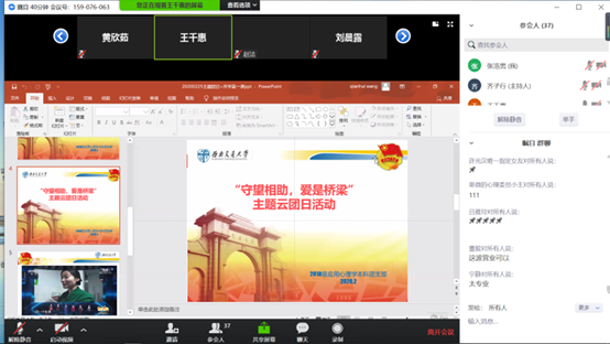 本科2018级团支部开展2020年第一次团日活动,主题为“守望相助,爱是桥梁”。本次团日活动由一班团支书王千惠主持,2018级全体团员通过瞩目app线上参加。