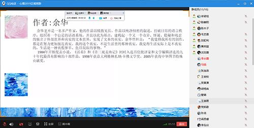 19本科生读书分享会于16:00准时开始,本次读书分享会由学习委员邹乐眉主持,通过QQ视频的方式进行。此次读书分享会响应李克强总理“建设书香社会”的号召,意在通过对各类文学作品的讨论,激发同学们对读书的积极性,提高大家对文学作品的鉴赏水平。