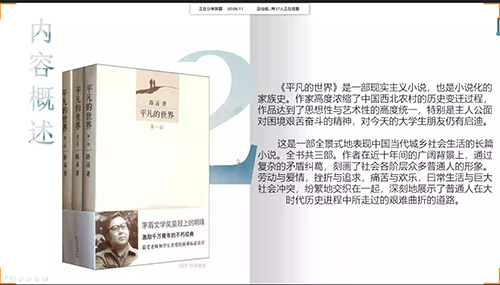 紧接着,董晶晶同学以PPT和视频结合的方式展现《平凡的世界》这部小说,把有血有肉的孙少平、孙少安两兄弟带到了同学们的眼前,也使同学们了解了路遥先生面对文学事业的神圣感。