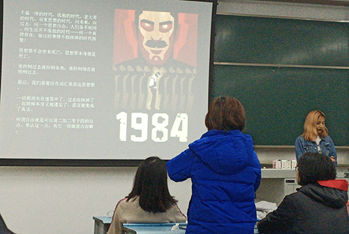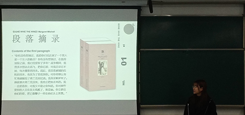 互动环节结束后,各小组依次派出代表向大家分享各自的推荐书目及阅读心得。六组同学推荐书目分别为:《一九八四》、《基督山伯爵》、《飘》、《百年孤独》、《瓦尔登湖》、《人性的弱点》。同学们大体上从书籍介绍,内容简介,人物评价,书评和读书感悟几个方面分享各组的推荐书目。各组主讲人准备充分,语言组织到位,能将所荐书籍清楚简洁地展现给在座同学。