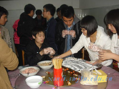 11月28号下午,同学们一同来到交大老彭餐厅的二楼,开始做着各种前期的准备工作。正所谓饺子好吃馅难调,不过还好这次的饺子馅是事先准备好的,同学们只是负责包的部分,要不然大家还真不知道该怎么下手。一开始,同学们被分成三组,分别在三个桌上进行,同学们个个都跃跃欲试,兴奋地心情溢于言表。饺子的皮和馅一上桌,此次活动的第一波高潮就开始了,各组成员你争我夺,恨不得立刻把材料给瓜分完。各组成员在拿到自己的材料之后,包饺子就正式开始了。虽然很少有同学专门学过怎样包饺子,但大家的表现还真不赖,那架势、那手法,还真不比专业人员差到哪去。当然,此时的一些同学也借机发挥自己的创新能力,把饺子包成各种形状,像飞碟、烧麦等等,使得其他人捧腹大笑。在传统包饺子的过程中,人们往往会在饺子里包进几个硬币,谁如果吃到硬币就预示着在今后一年里他会很有财运。此次活动同学们也遵循了这一程序,只是进行了稍稍的改变。大家会在包饺子的过程中,偶尔把几颗话梅包在饺子里,吃到话梅的人可以到班长那兑换硬币,当然,其中的意义都是一样的。此时大厅里的同学们就像一个真的大家庭一样,欢乐与和谐的氛围充斥了整个大厅。