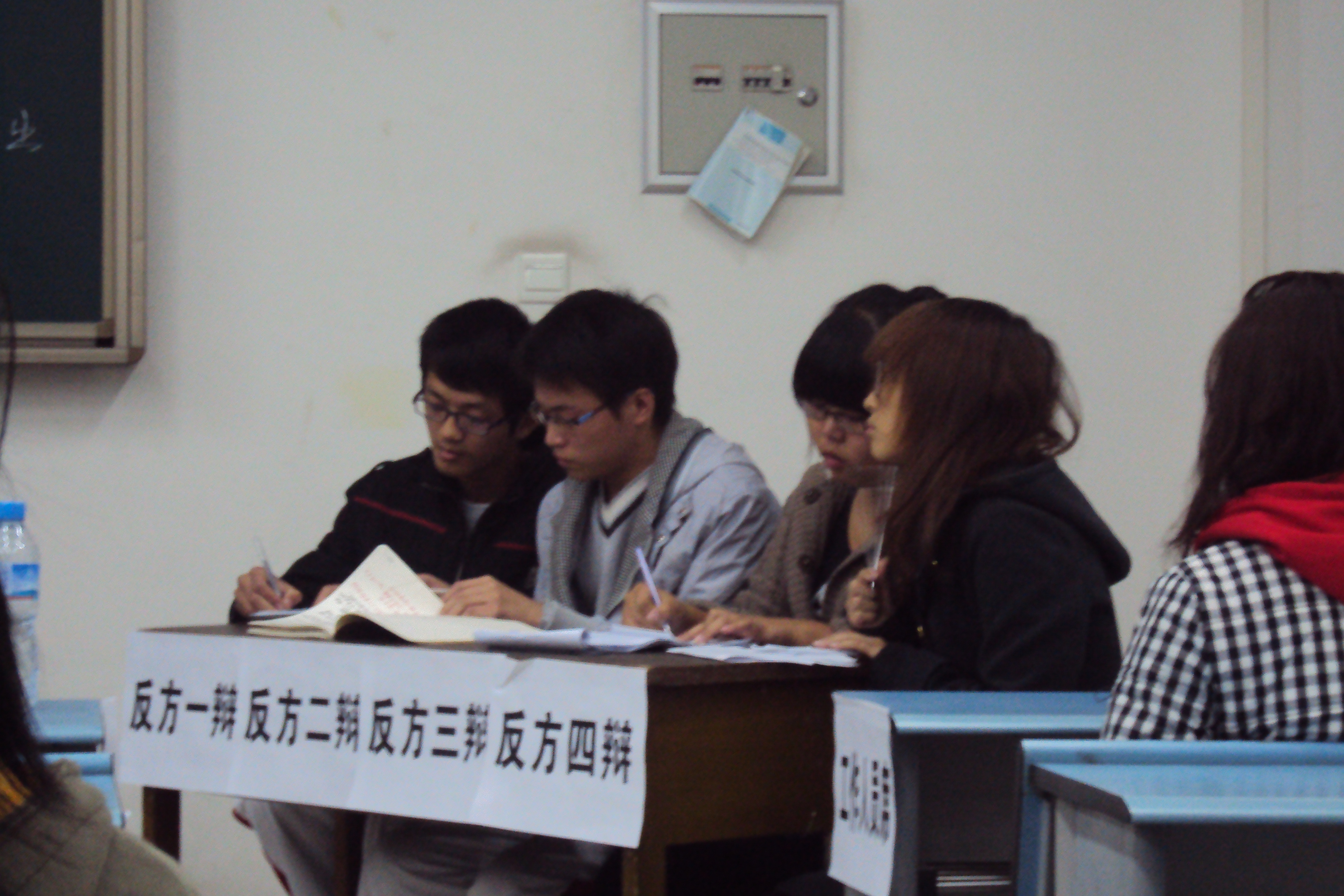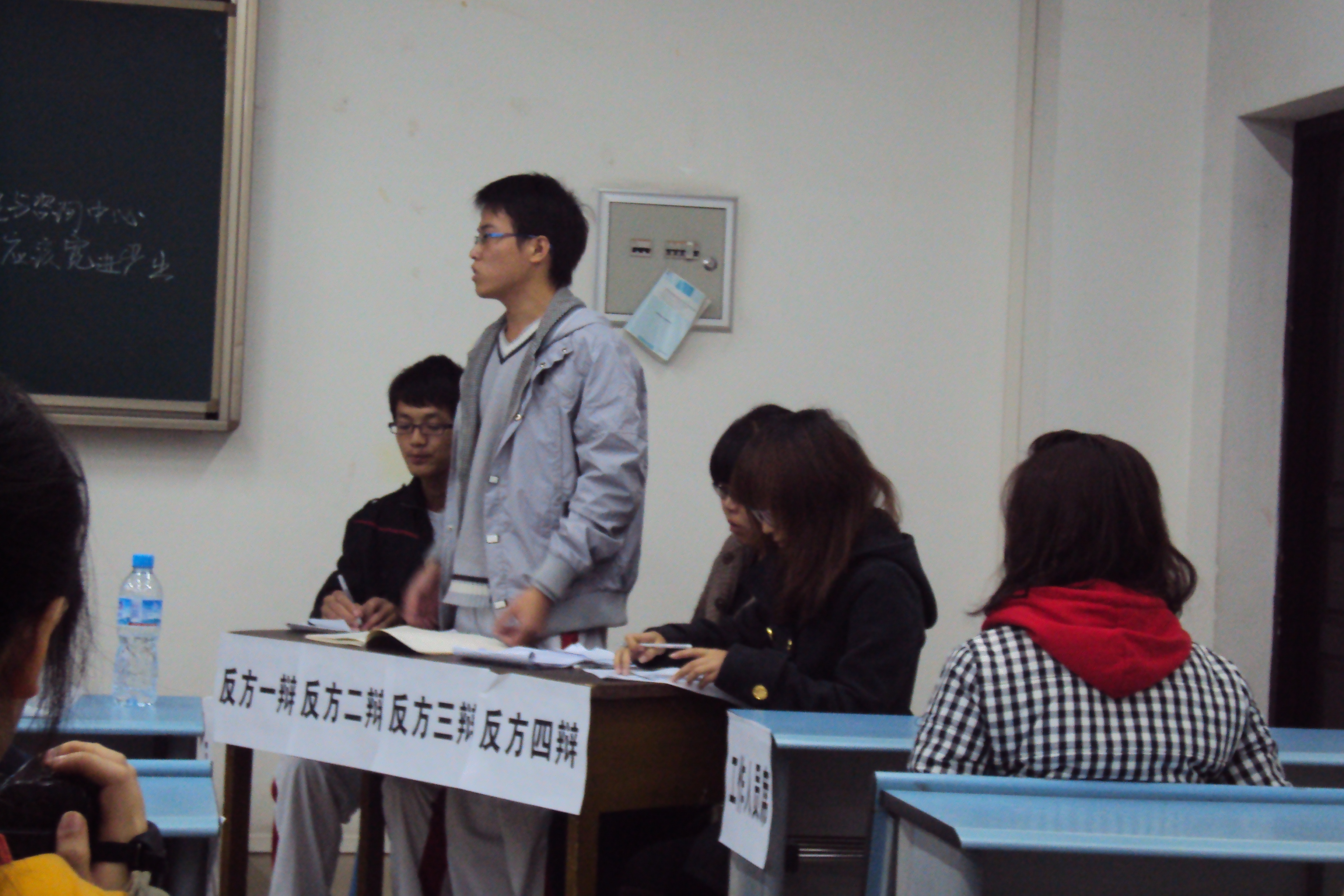 宽敞明亮的教室里,坐满了前来观战的各学院的同学们。来自外语、艺传、电气等学院的评委嘉宾落座后,两队辩手鱼贯而入,落落大方的做了自我介绍,赢得台下一片响亮的掌声。