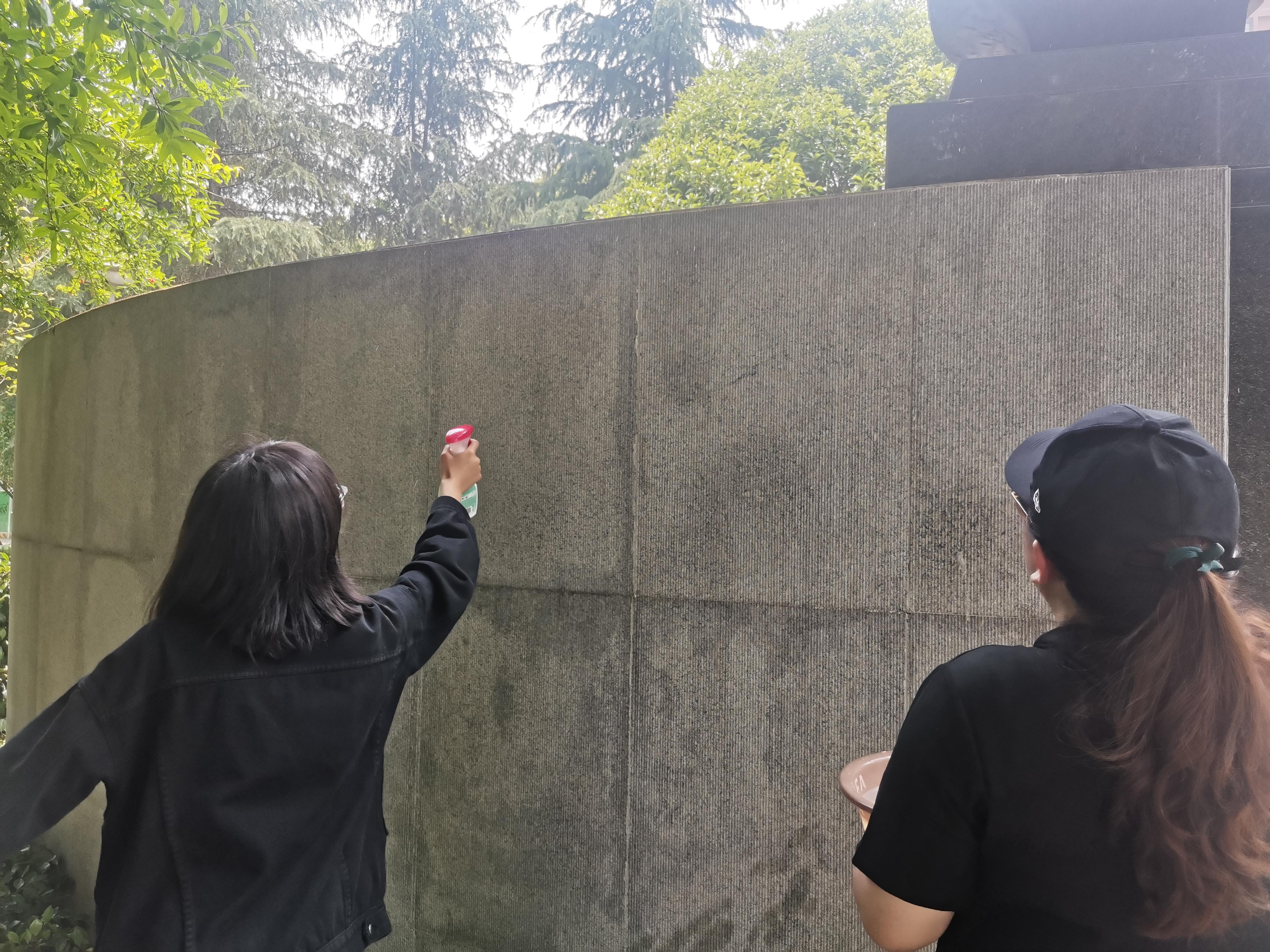 虽然下午二时正是日头最烈的时候,但是志愿者们并没有被炎热吓退,每一个人都细致耐心地完成了自己手头的工作。清理落叶的志愿者细致地照顾到纪念碑的每个角落,题字字缝里的积灰也不落下;喷洒清洁剂和擦拭洗涤的志愿者完美配合,把纪念碑表面的每一平方厘米都清洁到位。