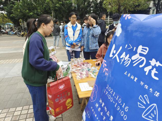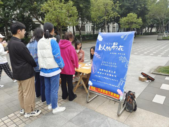 青年志愿者协会于2021年10月16日下午5点在西南交大犀浦校区三食堂前开展了“1>=1”以物易花活动。