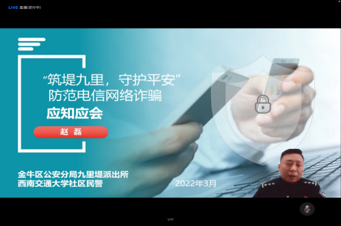 为落实校园防范电信网络诈骗工作,切实提升师生的安全防范意识,保障师生生命财产安全,2022年4月8日下午三点,AV大平台 联同马克思主义学院特意邀请九里堤派出所、西南交大社区民警赵磊为师生讲解“防范电信网络诈骗”专题讲座。此次讲座以线上方式进行,中心本研全体学生参与。