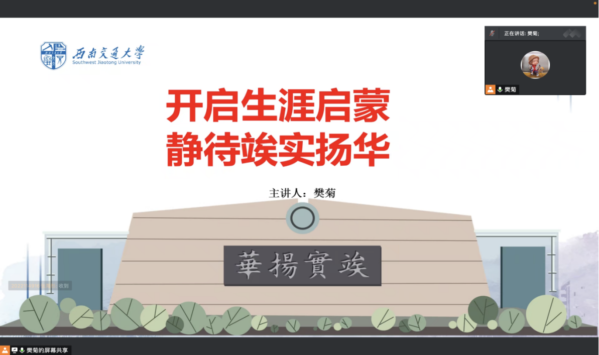 在线上面向2022级全体本科新生开展了主题班会,主题为“开启生涯启蒙,静待竢实扬华”。本次会议由本科新生辅导员樊菊老师主持,为全体同学进行生涯启蒙和规划指导。
