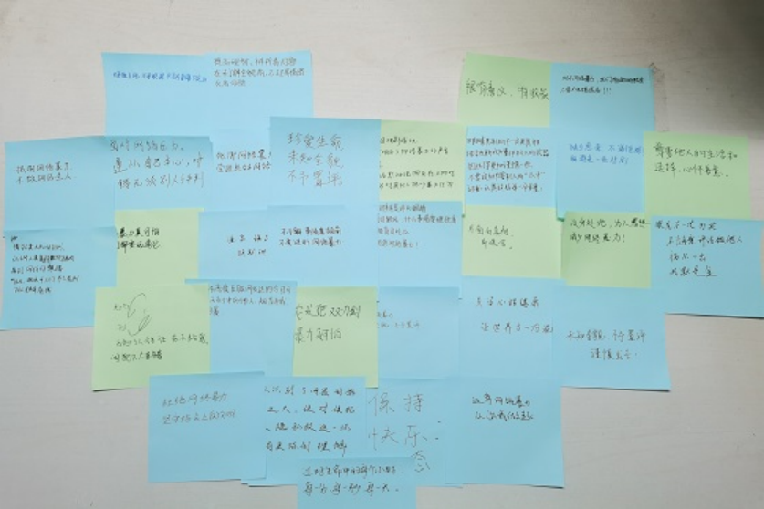 最后,主持人对此次活动进行总结,强调了心理健康的重要性以及网络暴力对于个人心理健康与社会群体的危害性,呼吁大家保持心理健康,树立积极向上的心理健康观念。在活动最后,主持人邀请同学们在便利贴上写下电影的观后感悟和相关心理健康知识,并组织同学们在签退后有序离场。