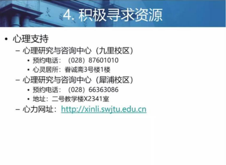 其次,冉老师分析了研究生群体普遍存在的心理困境,主要包括:人际关系挑战、学习内容变化、经济压力凸显、婚恋压力增大等。其中,冉老师教给新生同学们许多人际相处的小妙招,但最重要的还是在与人交往中做到勤沟通、善思考。最后,冉老师从四个重要方面提出了应对以上心理困境的方向和策略,包括:关注身心健康、提升社会支持、改变认知方式、积极寻求资源。重点介绍了开学后十月份有一个面向全校新生的心理测评及个别访谈,以及需要帮助的同学们可以在AV大平台 寻求免费心理咨询等学校心理健康服务。冉老师还向同学们介绍了研究生心理学会这一学生社团组织,是以研究生群体为依托的校级学生社团,开展心理健康教育活动,旨在提高研究生们的心理素质及自我调适能力,促进人格的发展与完善。