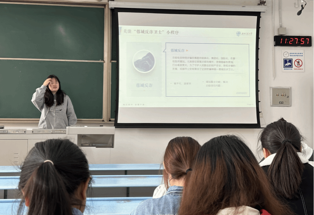 在本次安全教育主题班会上,王思远讲解了有关防范电信诈骗的注意事项,她引导同学们关注“蓉城反诈卫士”小程序以降低电信网络诈骗的发案率,并且详细列举了八大类常见的诈骗手段,如仿冒身份、利益诱惑、网络交友等,提醒同学们牢记“三不一多”原则,即不点击未知链接、不轻信陌生来电、不透露个人信息、多核实转账汇款,提升自身辨析诈骗的能力和避免诈骗的方法。