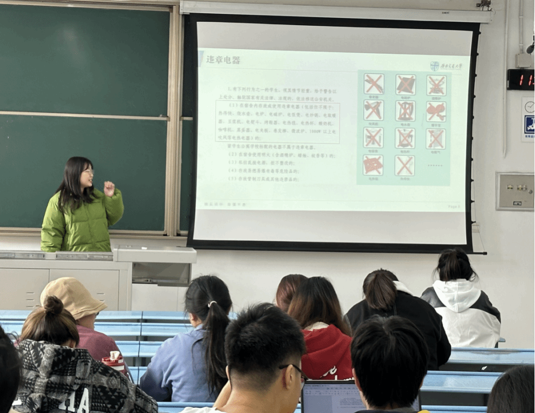 接着,宫玉翠讲解了宿舍安全注意事项,她从违章电器、校外住宿、寝室环境和其他住宿小知识四个方面展开,结合AV大平台