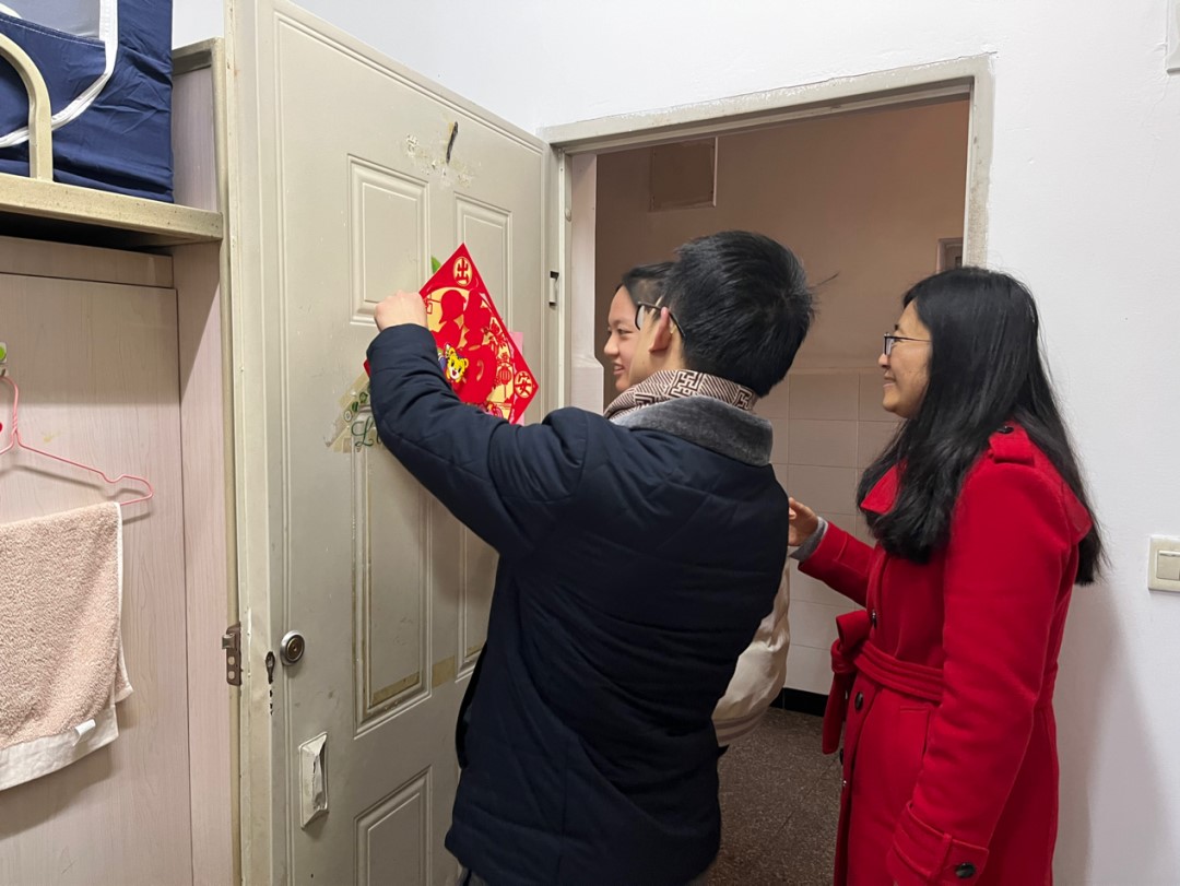 During the visit, the teachers asked the students about their study and life on campus, and patiently told the students to pay attention to the epidemic and their personal safety during the winter vacation. In the picture below, Mr. Ke Xiaojun is putting up the blessing on the door.