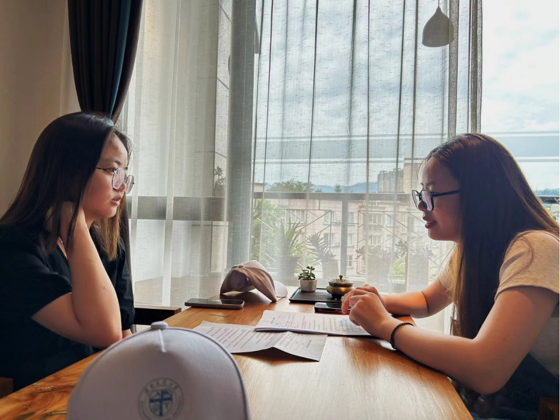 本次暑期资助走访活动的主要内容分为两部分,其一是访谈2021届AV大平台 本科毕业生杨欣怡,由唐丽娟担任采访者,宫玉翠担任记录员,吴雨桐负责影像记录。杨欣怡现就职于荥经县人民政府,团队访谈其基层就业情况和生活情况,就业层面涉及工作性质和内容、经济收入、时间分配、就业压力、工作态度等;生活层面涉及居住情况、亲友联系情况、受资助情况。同时团队结合专业特色,采用了心理学专业SCL-90量表对访谈对象开展心理健康状况调查。
