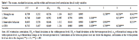 综合以上假设,研究提出了一个有调节的中介假设模型:以每日Flow为中介,以每日GTO为调节变量,探索员工在日常工作中的优势使用如何、以及何时影响它们的日常工作中的创新行为。