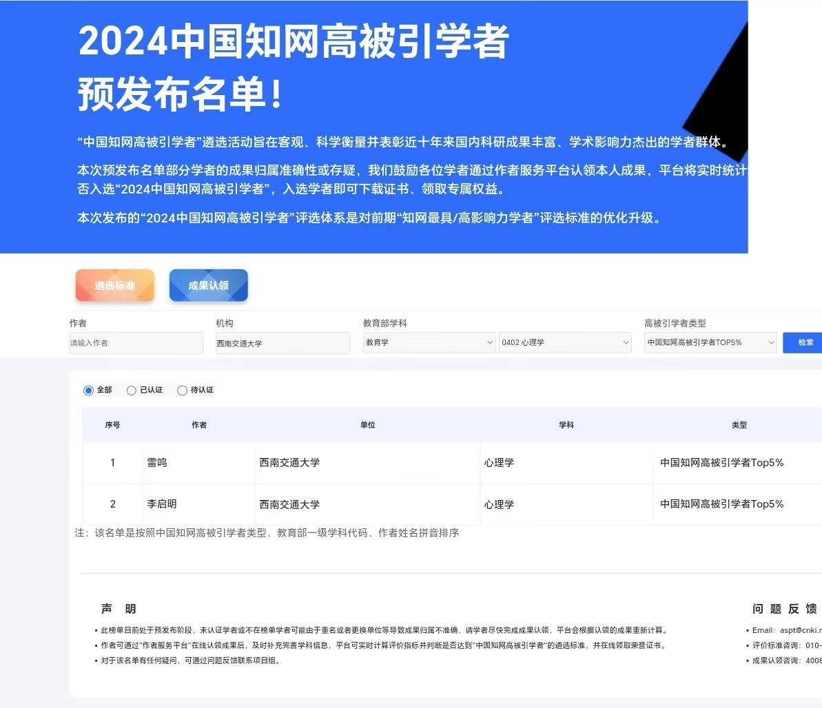 中国知网中国科学文献计量评价研究中心基于中国知网收录的国内学术期刊论文和会议论文,2024年首次开展学者学术影响力客观评价,遴选了“2024中国知网高被引学者”名单。“2024中国知网高被引学者”采用的评价指标为作者发表论文的加权总PCSI。PCSI是指论文引证标准化指数(Paper Citation Standardized Index),系知网为实现论文跨学科、跨年度可比而对论文被引频次的标准化数值。