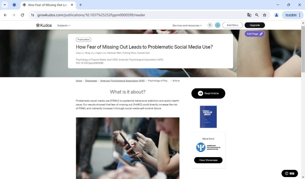 近日,高雪梅教授团队在美国心理学会会刊《Psychology of Popular Media》(JCR一区,IF5=2.6)在线发表研究论文“Problematic Social Media Use Increases With Fear of Missing Out Among Young Adults: A Three-Wave Longitudinal Study”,并受美国心理学会邀请,在其合作的Kudos网站进行专栏科普,从自我控制的视角深入探讨了错失恐惧如何影响问题性社交媒体使用。