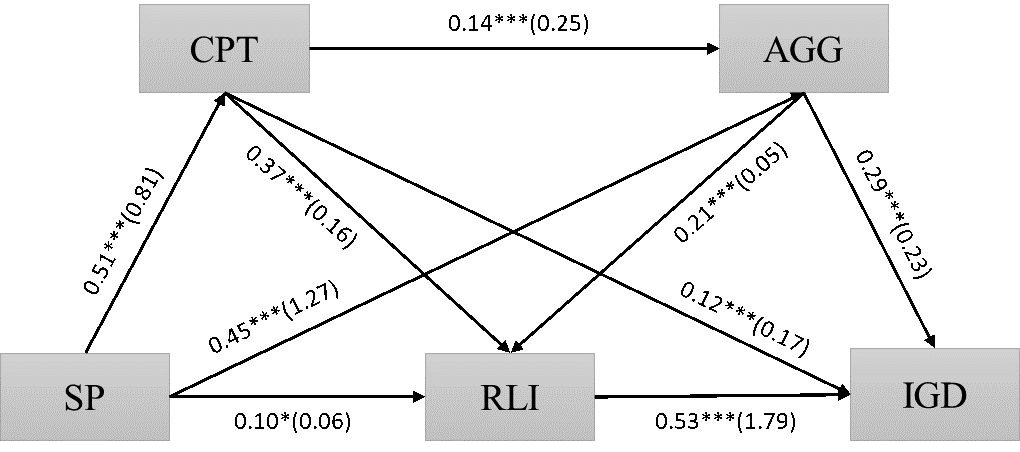 结果表明社会比较、人格特质和IGD之间均存在显著的相关关系,社会比较对IGD的影响是通过完全中介来调节的。具体而言,在单变量中介效应中,竞争力(B=0.118,95%CI[0.024,0.216])和攻击性(B=0.272,95%CI[0.191,0.365])中介效应显著,而RLI中介效应不显著(B=0.114,95%CI[0.002,0.235])。在双变量链式中介模型中,竞争力和攻击性的链式中介效应显著(B=0.044,95%CI[0.020,0.075]),占中介效应的4.21%;竞争力和RLI的连锁中介效应显著(B=0.227,95%CI[0.154,0.313]),占中介效应的21.74%;攻击性和RLI的连锁中介效应显著(B=0.111,95%CI[0.0600.172]),占中介效应的10.63%。最后,竞争力、攻击性和RLI这三个变量的连锁中介效应显著(B=0.018,95%CI[0.0070.033]),占中介效应的1.72%。这揭示了社会比较可能是IGD被忽视的成因,社会比较可以直接通过攻击性、竞争性间接预测玩家的IGD风险,但不能通过战力品盒使用间接预测。有意思的是,由社会比较引发的竞争性和攻击性上升可以间接增加RLI,最终预测更高水平的IGD。