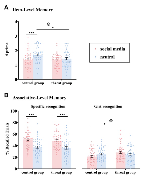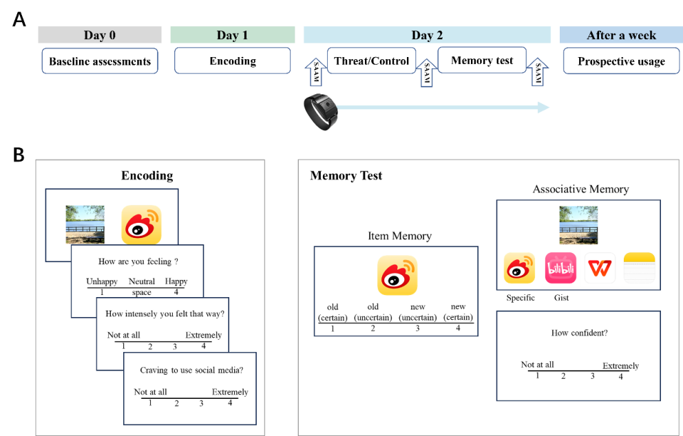 研究基于记忆抽样框架理论(Memory Sampling Framework),聚焦“依恋威胁”这一关键心理应激源,通过回忆书写任务和实验室情景记忆任务(图1),发现依恋威胁情境显著激活了个体的依恋系统,使其表现出更高的生理唤醒和主观依恋不安全感,并选择性地影响了后续的记忆检索过程。具体表现为减少了对中性项目记忆的提取,增强了对社交媒体相关联结的记忆偏向(图2)。
