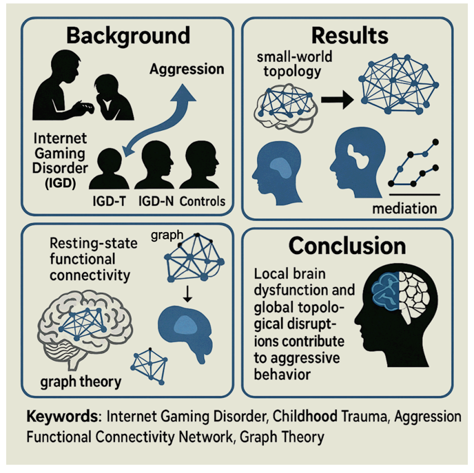 前人研究发现青少年网络游戏成瘾(Internet Gaming Disorder, IGD)往往与攻击行为共现,尤其在童年创伤史的人群中更为凸显,但二者之间到底通过怎样的神经网络机制相互作用,一直缺乏系统证据。高雪梅教授团队发表在《Brain Communications》(Q1,中科院2区,IF = 4.5)的最新研究从“功能网络拓扑”的视角给出了答案。