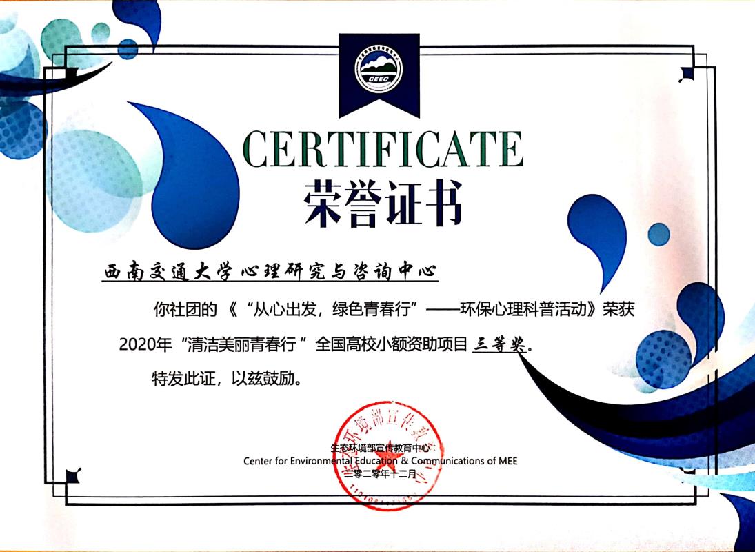 科普基地荣获2020“清洁美丽青春行”全国高校小额资助项目三等奖