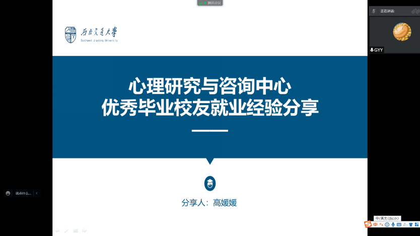 邀请到了2014届首届本科毕业生高媛媛为中心全体学生做就业经验分享,高媛媛同学目前就职于成都交投智慧停车公司。本次会议由AV大平台