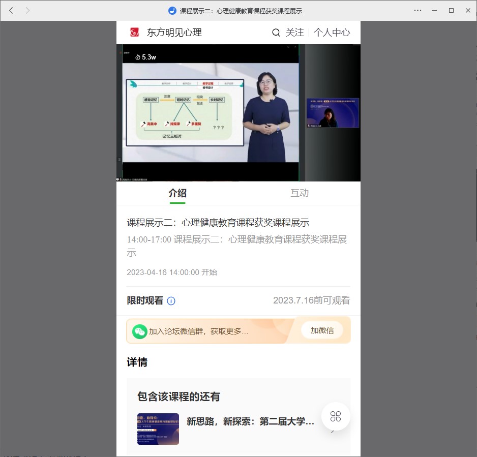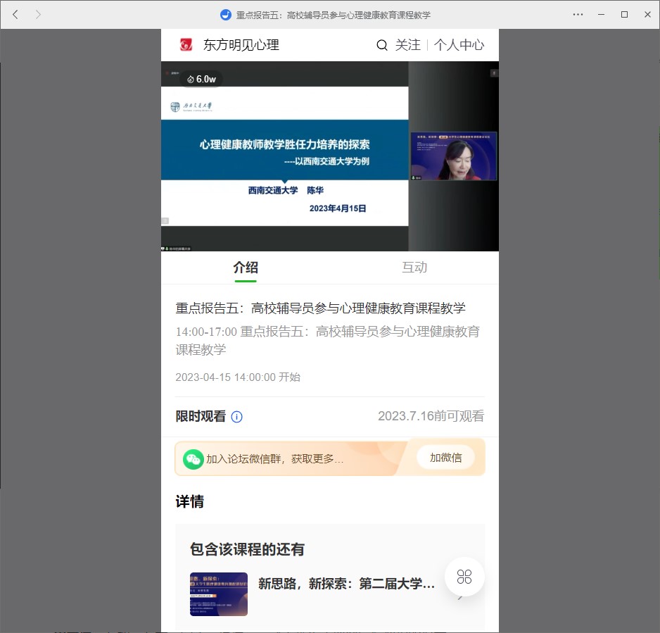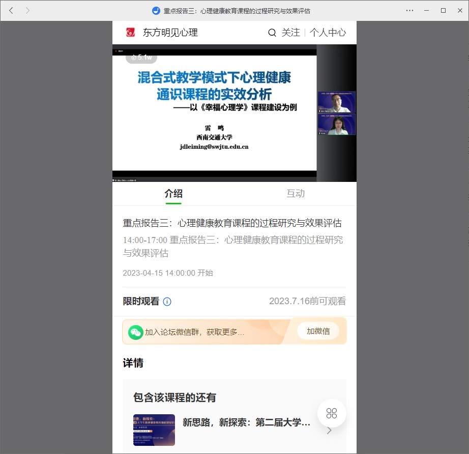 416日下午,冯果博士以《“记忆有办法”微课实践展示》为题,在“心理健康教育课程获奖课程展示”环节中和与会人员分享了这段微课程的创作经历以及自己的反思。