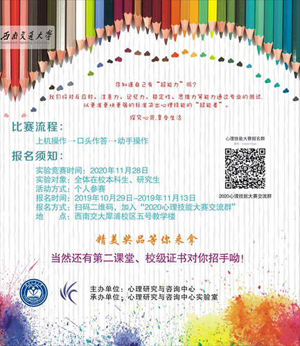 你知道自己有“超能力”吗?我们将对反应时、注意力、记忆力、稳定性、思维力等能力通过专业的测试,以更准更快更强的标准决出心理技能的“超能者”。探究心灵,享受生活比赛流程:上机操作 → 口头作答 → 动手操作报名须知: 实验竞赛时间:2020年11月28日 实验对象:全体在校本科生、研究生活动方式:个人参赛报名时间:2019年10月29日-2019年11月13日报名方式:扫码二维码,加入“2020心理技能大赛交流群”地 点:西南交大犀浦校区五号教学楼精美奖品等你来拿当然还有第二课堂、校级证书对你招手呦!主办单位:AV大平台 承办单位:AV大平台 实验室