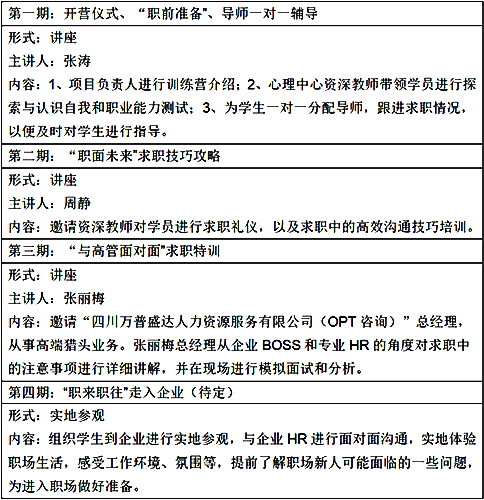 4. 邀请的嘉宾均为职场精英,在职场适应能力训练营中,同学们可以提前了解自己的职业能力、求职礼仪、人际关系、高效沟通技巧、自我探索与认识等方面的内容,从而反观大学生活,进行有针对性的能力培养和提升,做好未来的职业规划,便于就业。